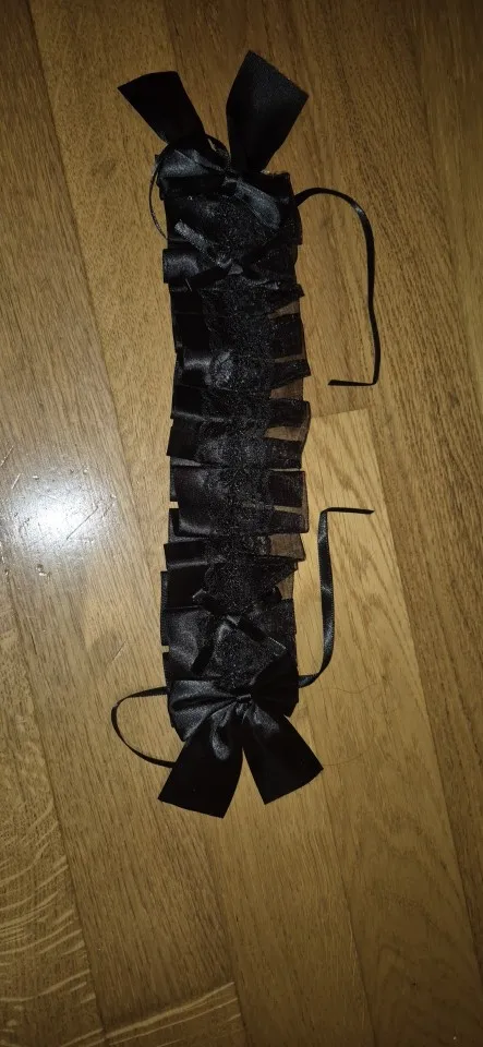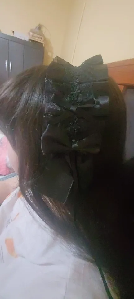 Its really adorablw exactly as in the picture, however jts a little bit shorter than i thought. It has both hairpins and ribbon to wear it, didnt take a pic tho