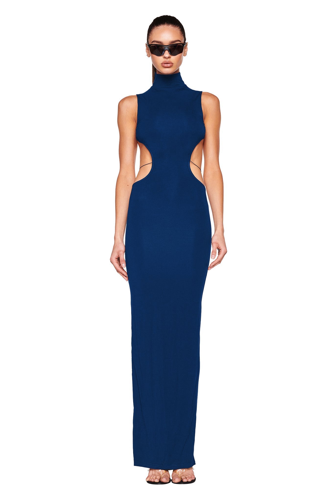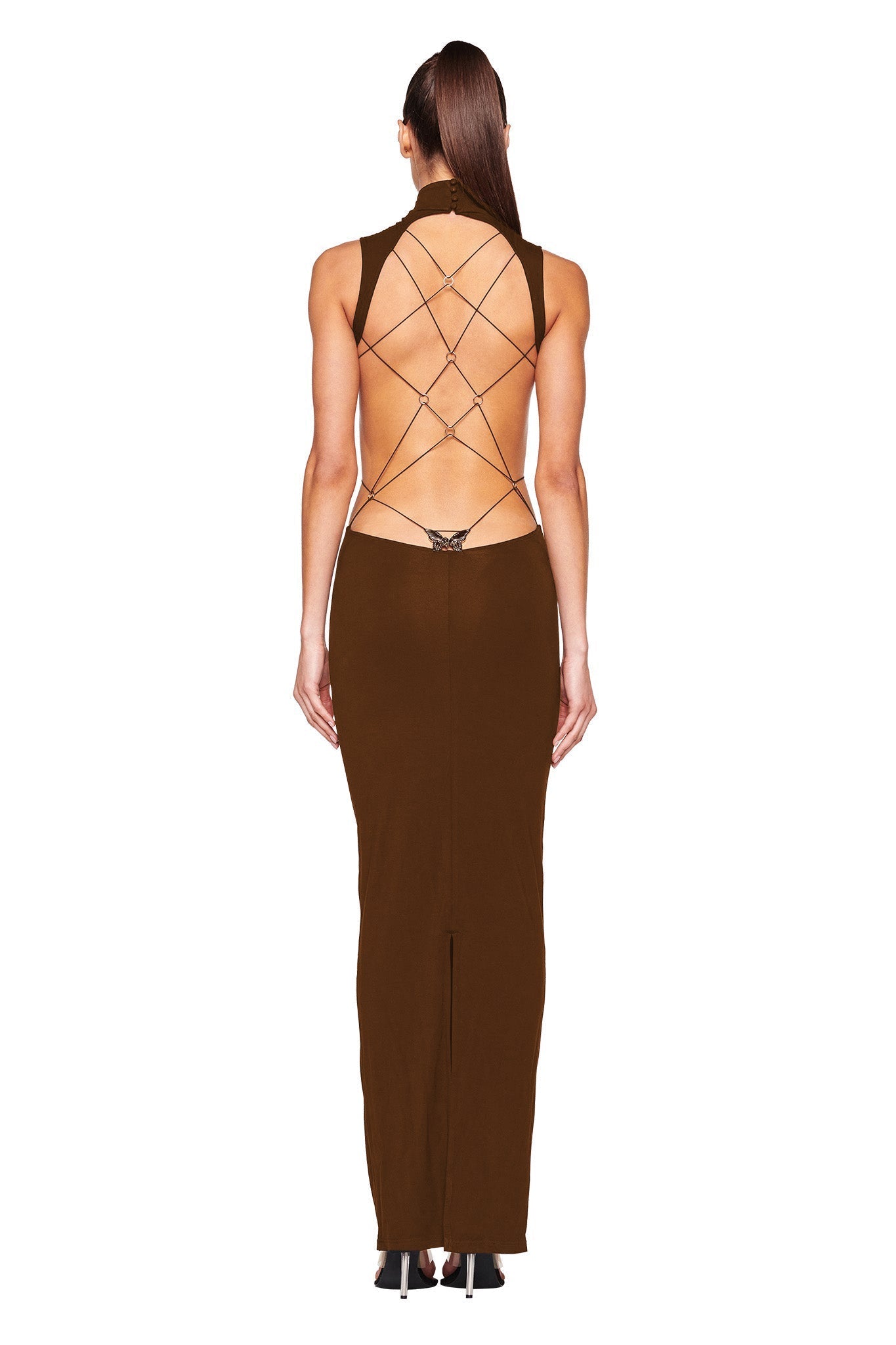 This floor length, form fitting dress features a high cut neck, and a wide open back with criss cross jeweled straps.