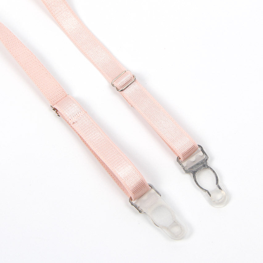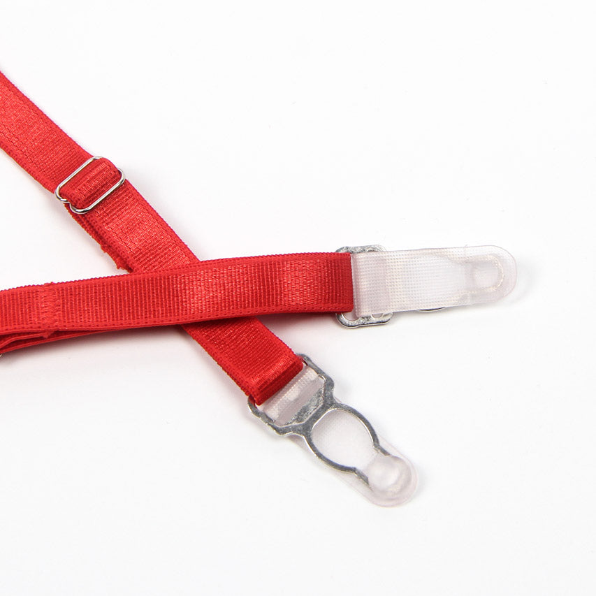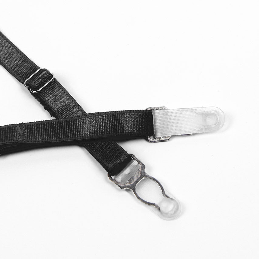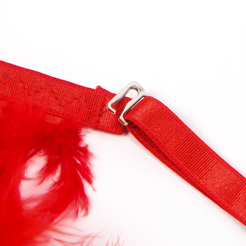 This flirty set includes a lace bra with underwire cups, a strappy chain bust, faux feather trimmed shoulder straps, lace panty, feather trimmed garter belt, and leg garters.