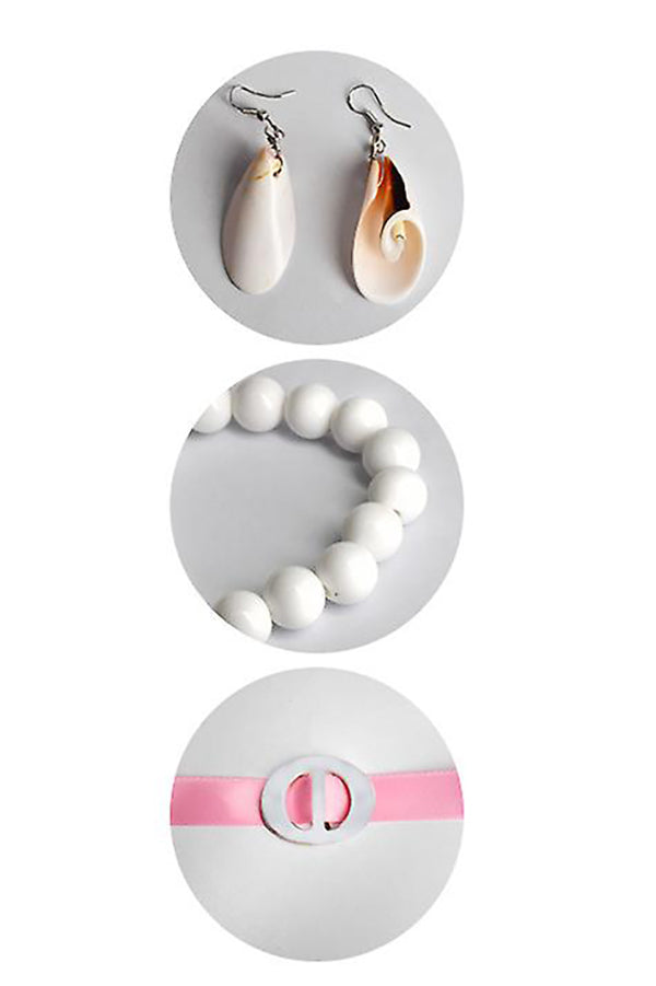 This Green Beach Party Doll's Best Friend costume includes a green, fit and flair dress with pink trim, satin tie bow shoulder strap, faux belt, and seashell jewelry.