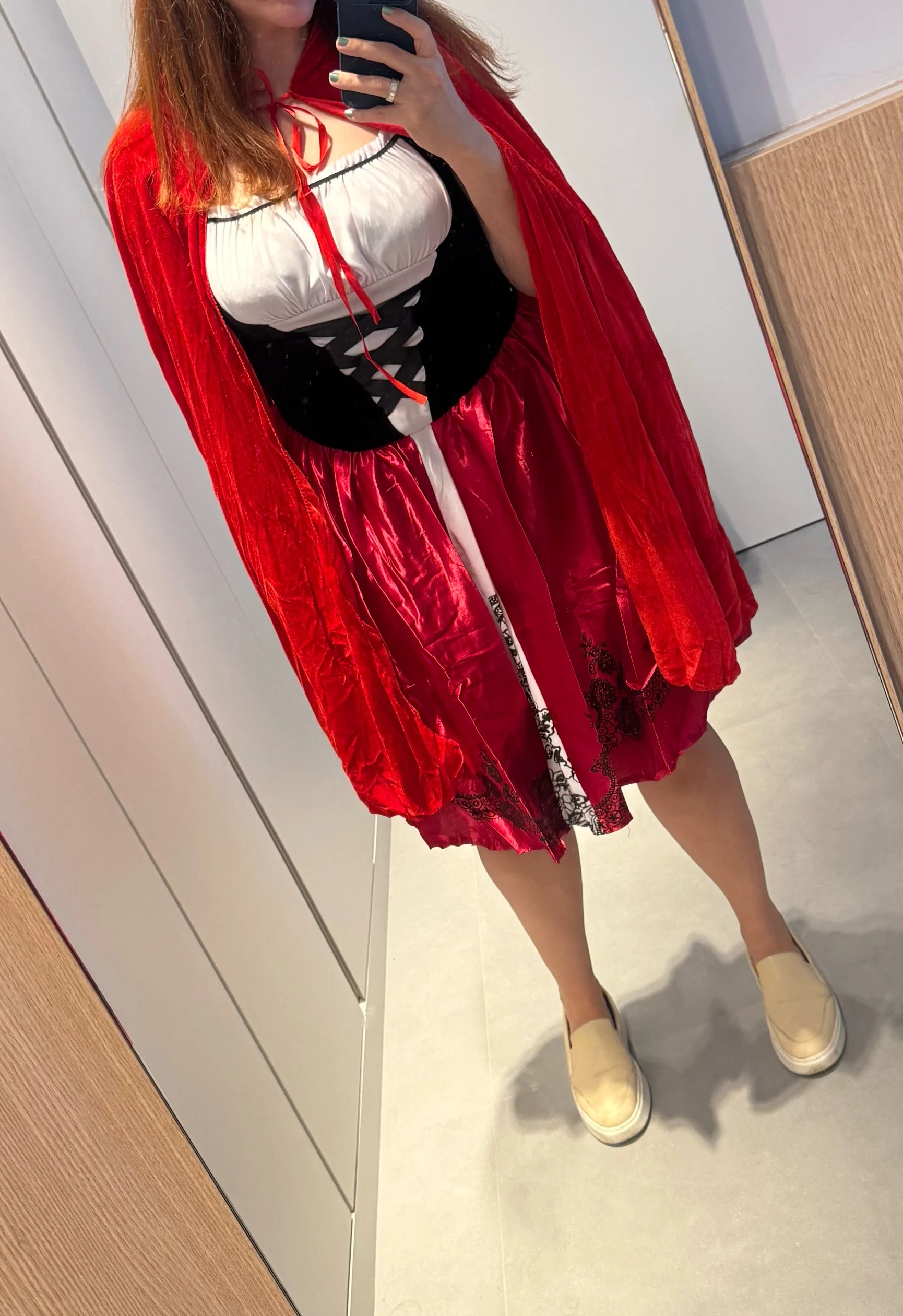 This Little Red costume includes a black and red mini dress with a layered skirt, attached apron, lace-up front, ruffled bust trim and a matching long red satin red riding hood cape. The closest costume you can get to look like little red riding hood. (Gloves, petticoat and stockings not included.)