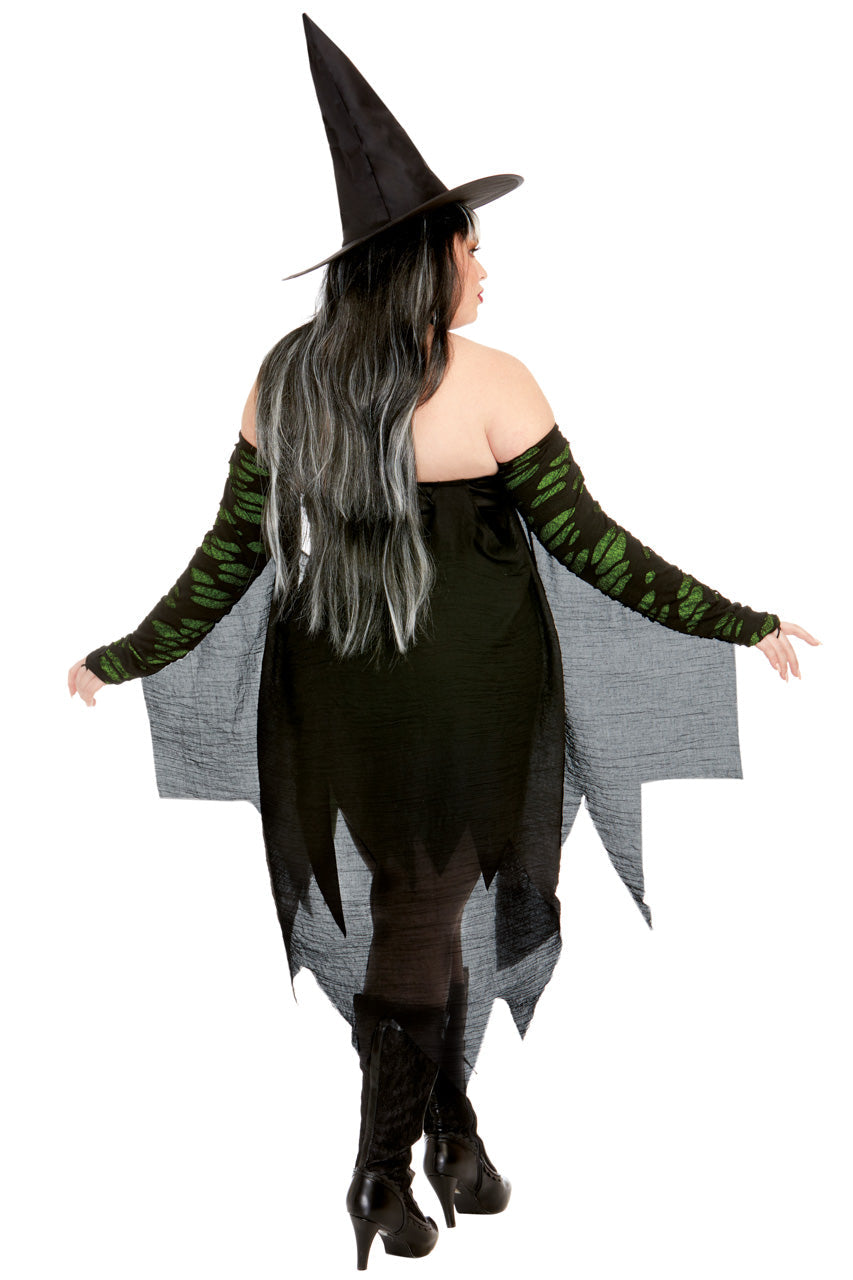This plus size, Miss Enchantment witch costume includes a black shredded knit dress with lime green lining, attached sleeves, attached gauze cape, belt with an oversized buckle, and witch hat.