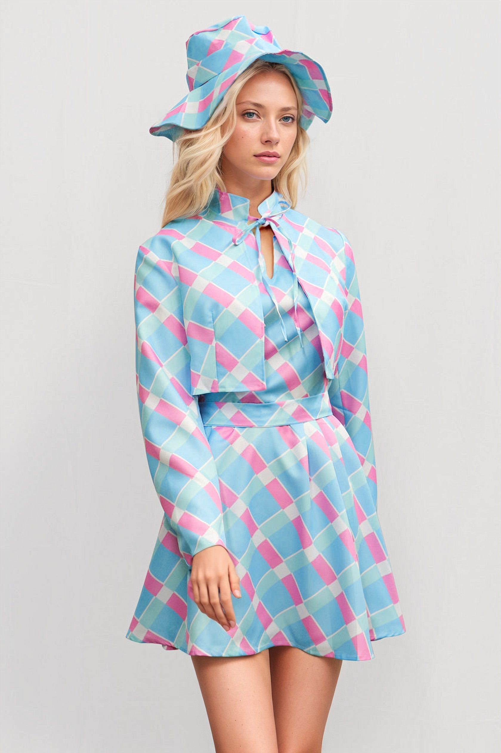 Travel to new lands in this Adventure Doll costume featuring a blue patterned dress with a cinched waist, an overcoat with neck clasp closure, belt, and hat.