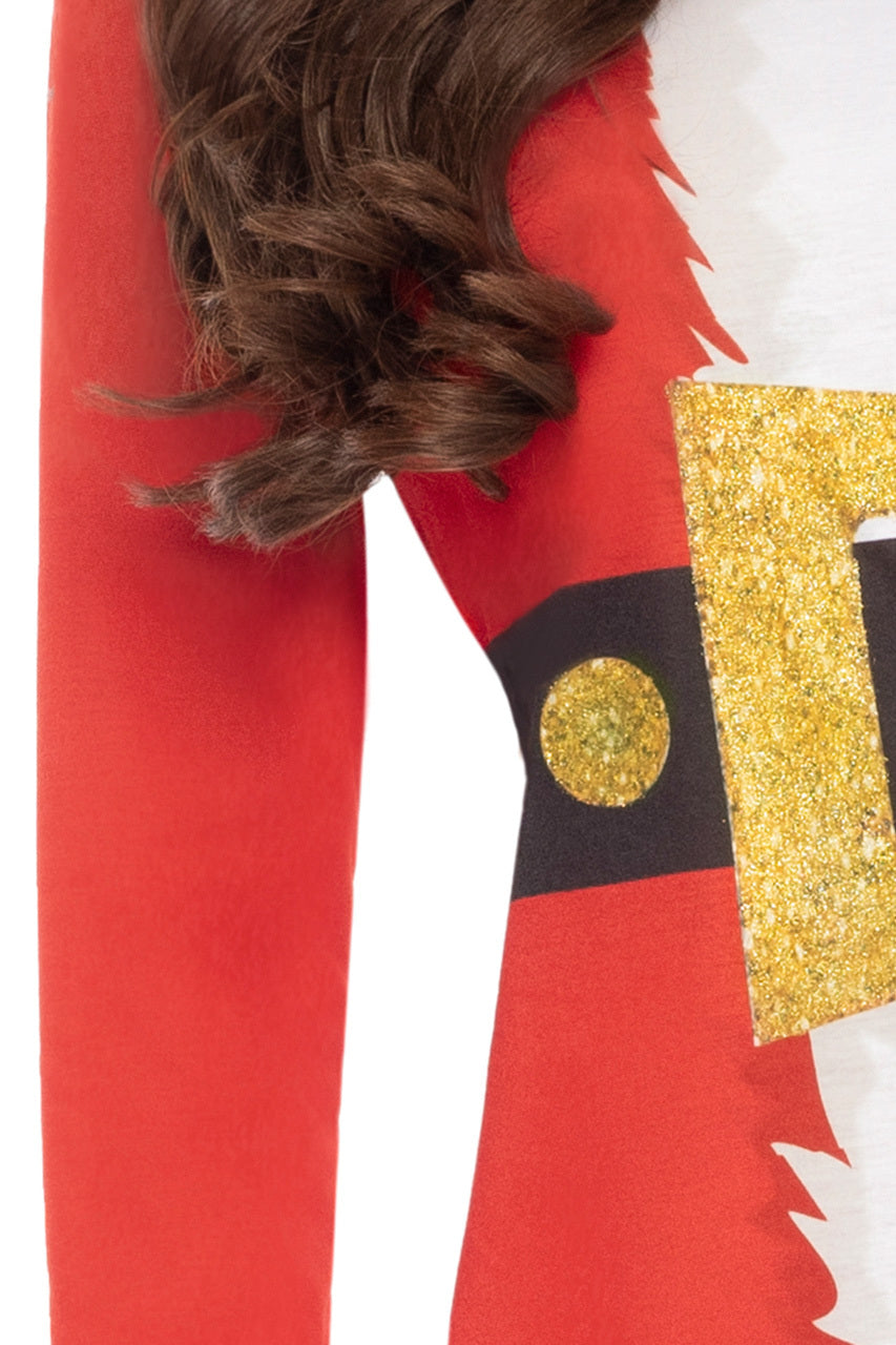 This red Santa dress features long sleeves, attached hood and Santa coat pattern.
