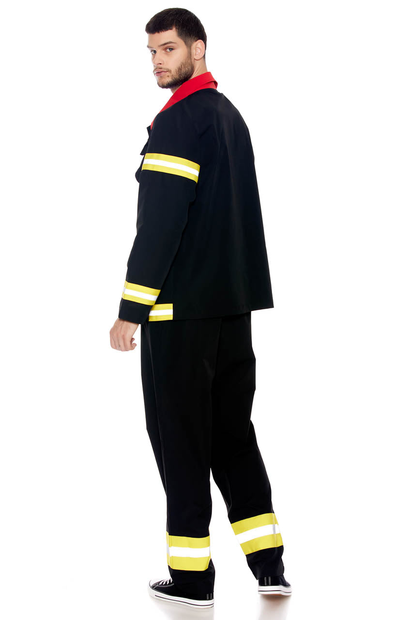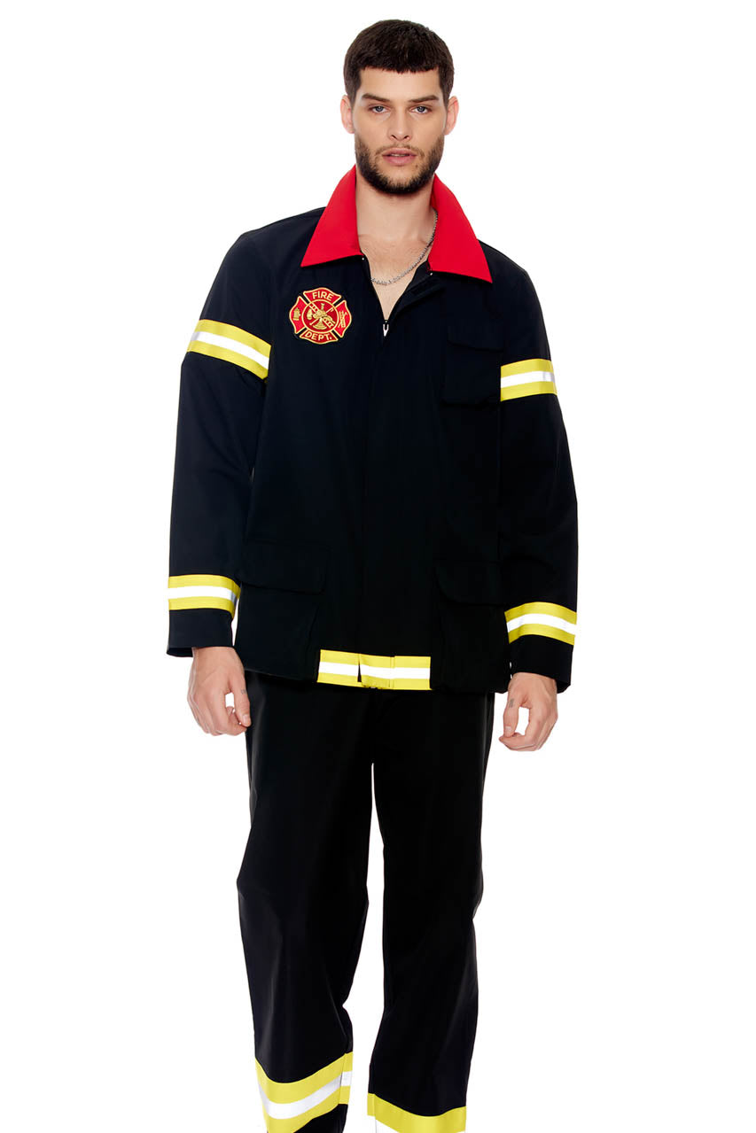This two-piece, Where's The Fire Men's Firefighter costume features a zip front jacket with ornamental patches, reflective stripes, and matching pants.